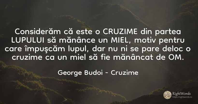 Considerăm că este o CRUZIME din partea LUPULUI să mănânce un MIEL, motiv pentru care împuşcăm lupul, dar nu ni se pare deloc o cruzime ca un miel să fie mănâncat de OM.